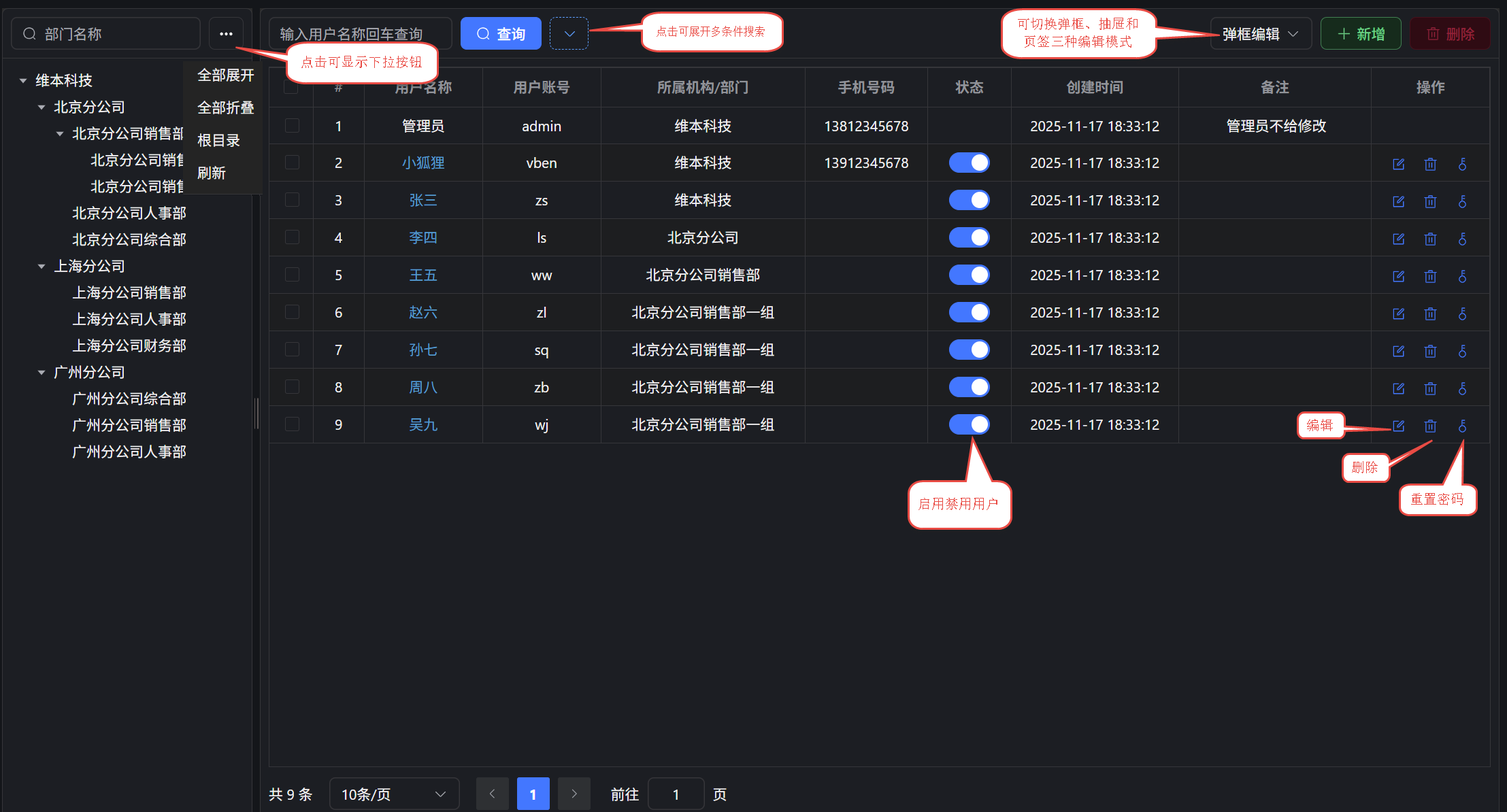 点击左侧部门树节点后,右侧员工分页列表会筛选该部门下的员工。右侧搜索栏只要有其他查询条件就会忽略所属部门条件。