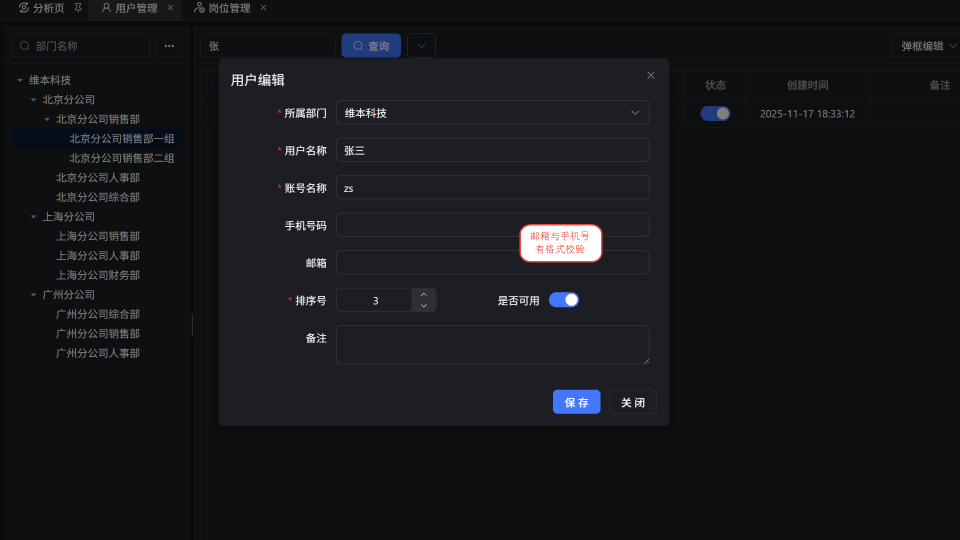 对于企业项目,用户一般就对应企业的所有员工。但是如果基于vben做人事系统的话,建议另外做一个员工表,与用户表做关联。