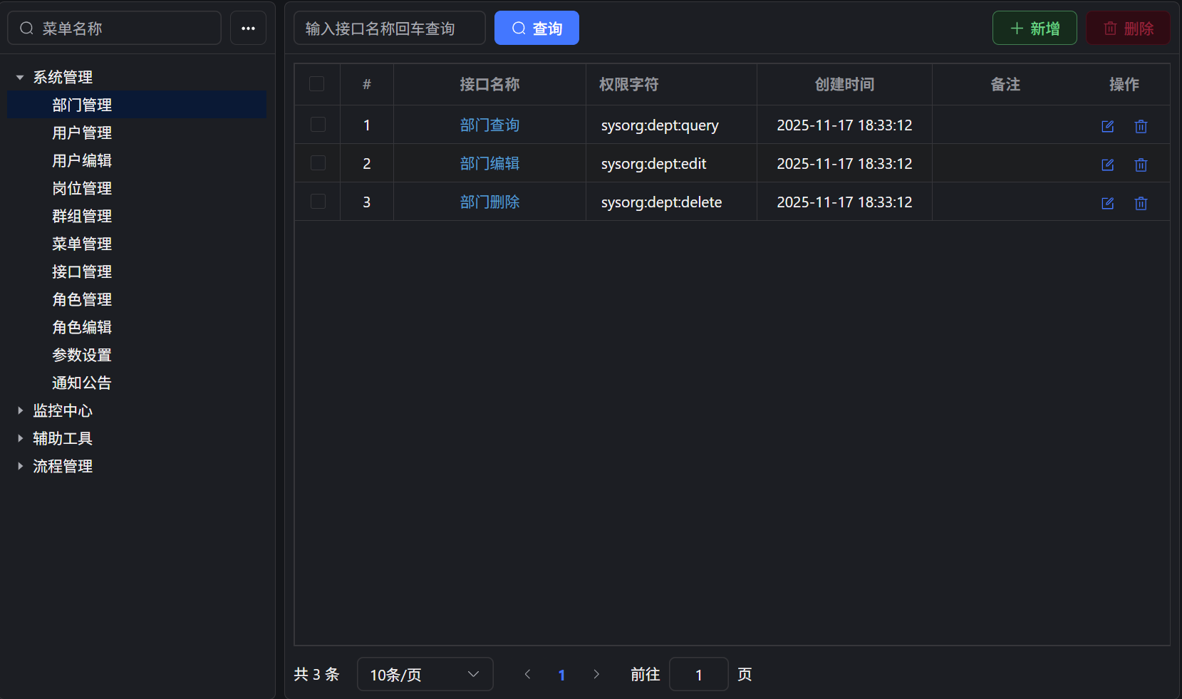 接口可通过后台应用的 @SaCheckPermission 注解自动生成。如 @SaCheckPermission("sys:notice:query"),就自动生成一条权限字符为sys:notice:query的数据库记录。